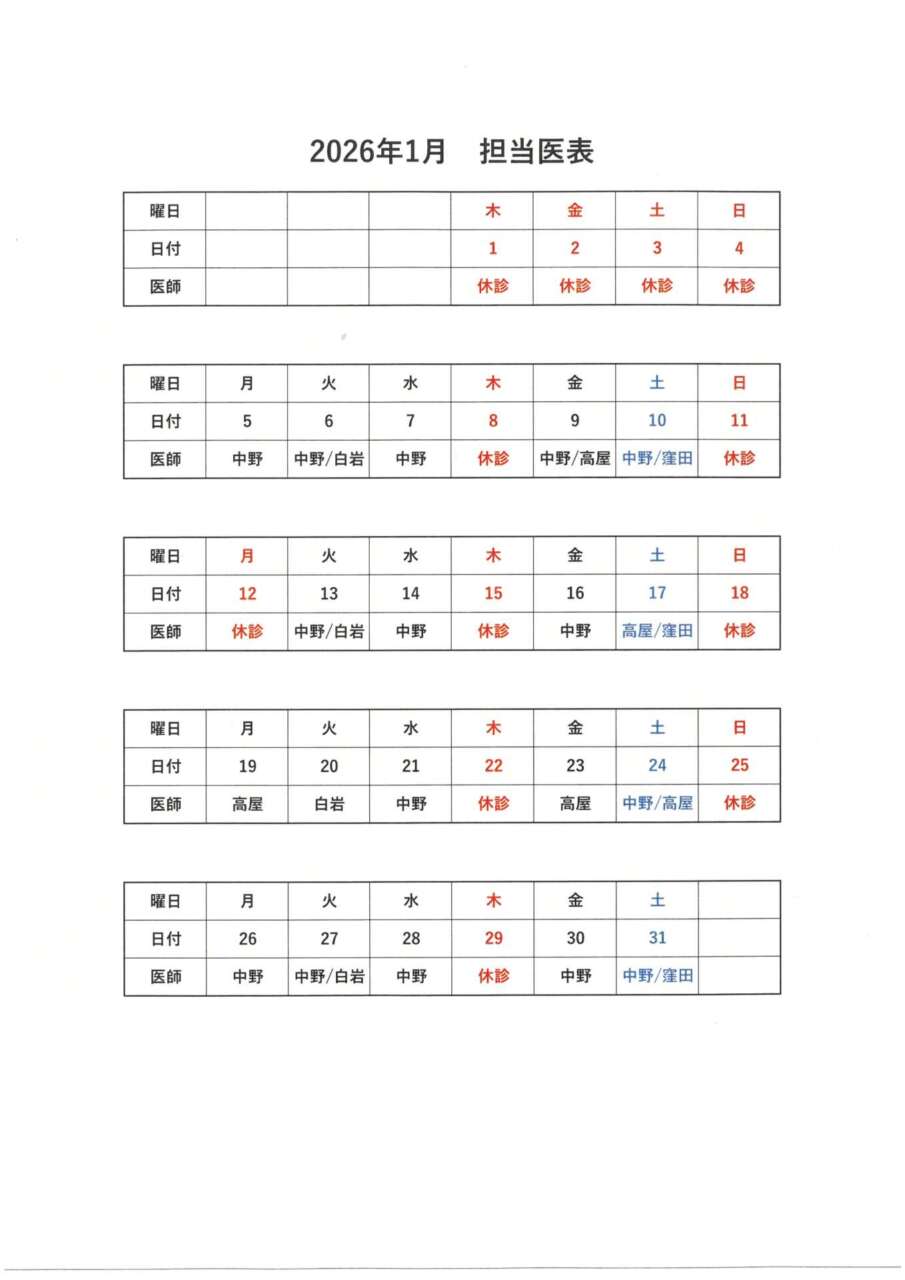 1月の担当医表です。